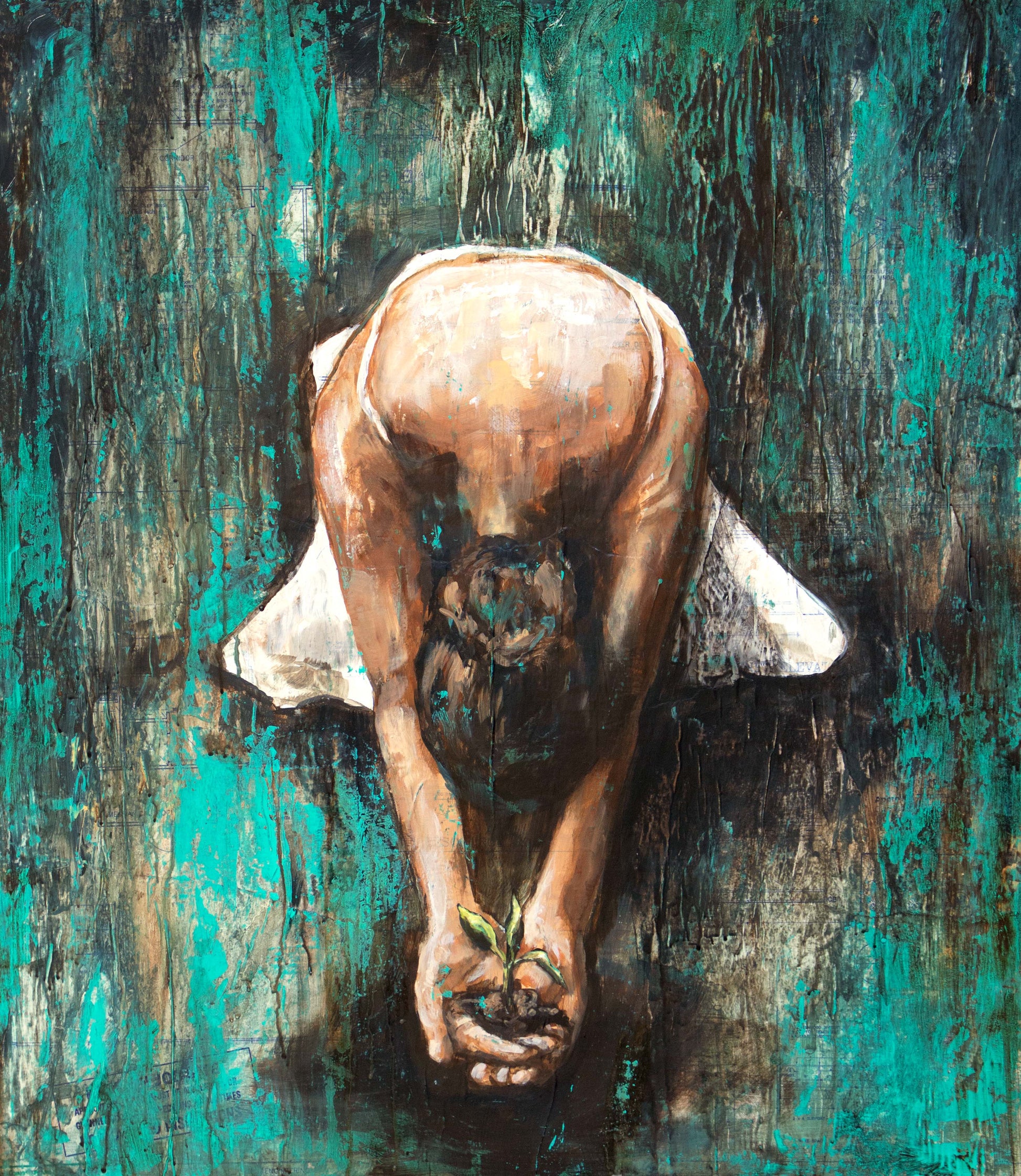 "Excavated" started with a base of vintage blueprints. God has a blueprint/plan for our lives. It is up to us to uncover the seeds that He has planted and nurture them to maturity. He wants us to produce ripe fruit.